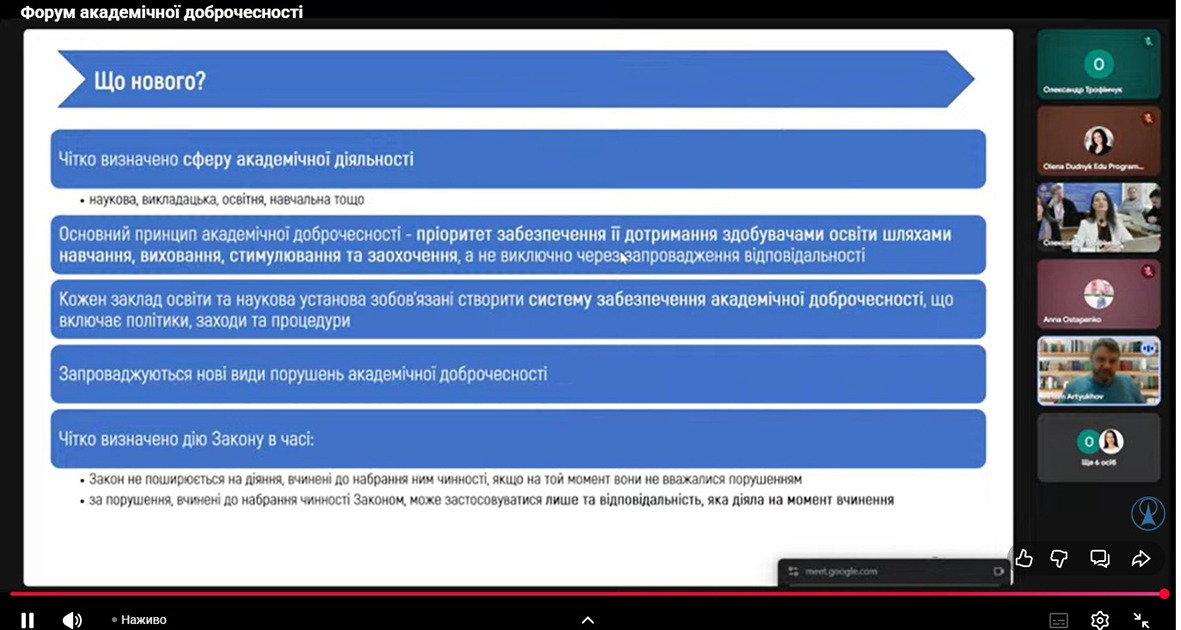 Були обговорені нові інтенції, пов’язані з прийняттям Закону України «Про академічну доброчесність», застосуванням цифрових інструментів виявлення плагіату та академічних зловживань, а також формуванням внутрішніх політик та актуалізацією ролі бізнесу у сфері забезпечення доброчесності в закладах освіти.