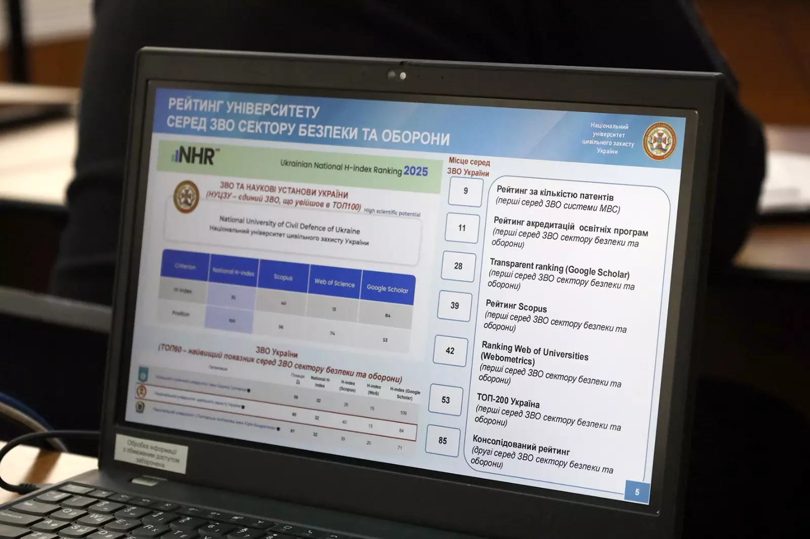 Отримані наукові результати дозволили університету посісти найвищі позиції в міжнародних та національних рейтингах, як серед ЗВО ДСНС та МВС так і сектору безпеки та оборони України в цілому.