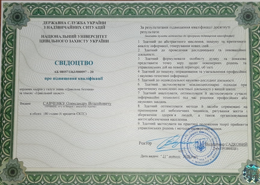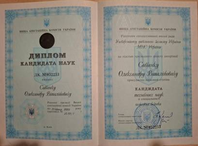 Кандидат технічних наук за спеціальністю 21.06.02 «Пожежна безпека», 2009 рік.