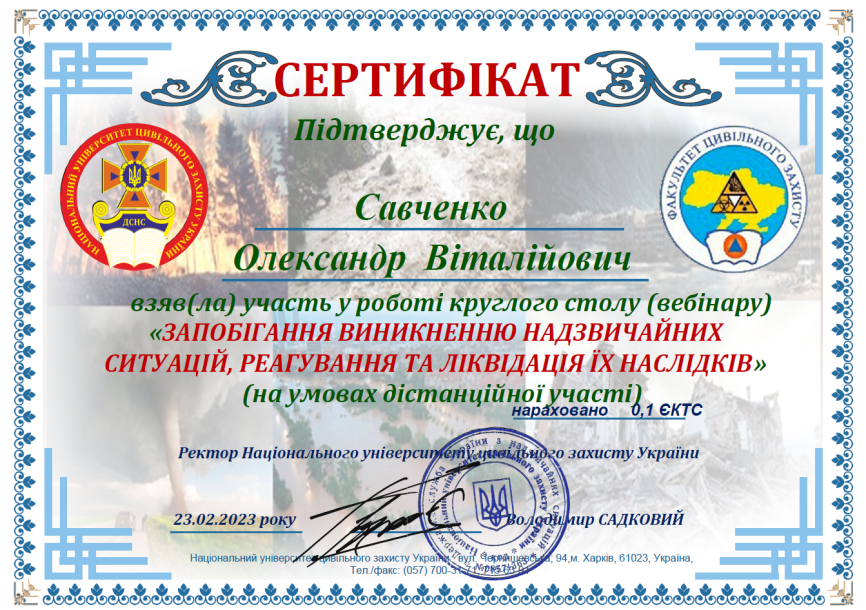Викладаю дисципліни «Інженерний захист територій та укриття населення», «Нормативно-правове регулювання заходів цивільного захисту».